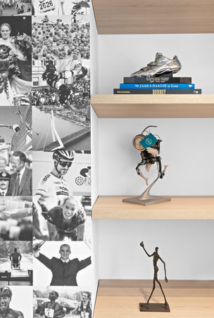 En de kers op de taart? Een paar legendarische fietsen die de muur van de vergaderzaal aankleden. Een extra knipoog naar het wielrennen komt ook terug in de lampen boven de tafel.